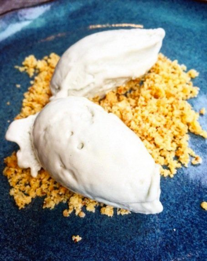 Ya no hay, espero que temporalmente, tarta de queso. Era una de las mejores de Madrid porque se atrevían con los más fuertes y la elaboraban con quesos intensos. La ha sustiuido, muy bien eso sí, el helado de queso azul que se puede comer con o sin migas de galleta. Con ellas estaba realmente bueno porque la galleta semisalada le hace un postre tan distinto que también puede ser una guarnición o una entrada.