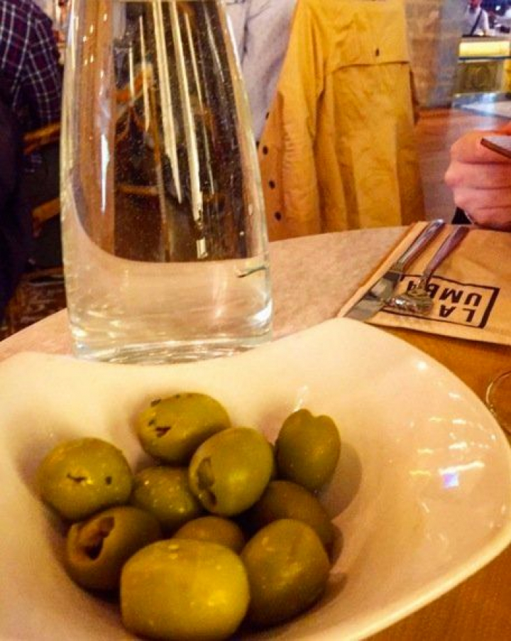 De la comida poco que decir, que nada más sentarnos nos reciben -como en Nueva York- con agua del grifo y aceitunas -esto no es como allí, es más de aquí-