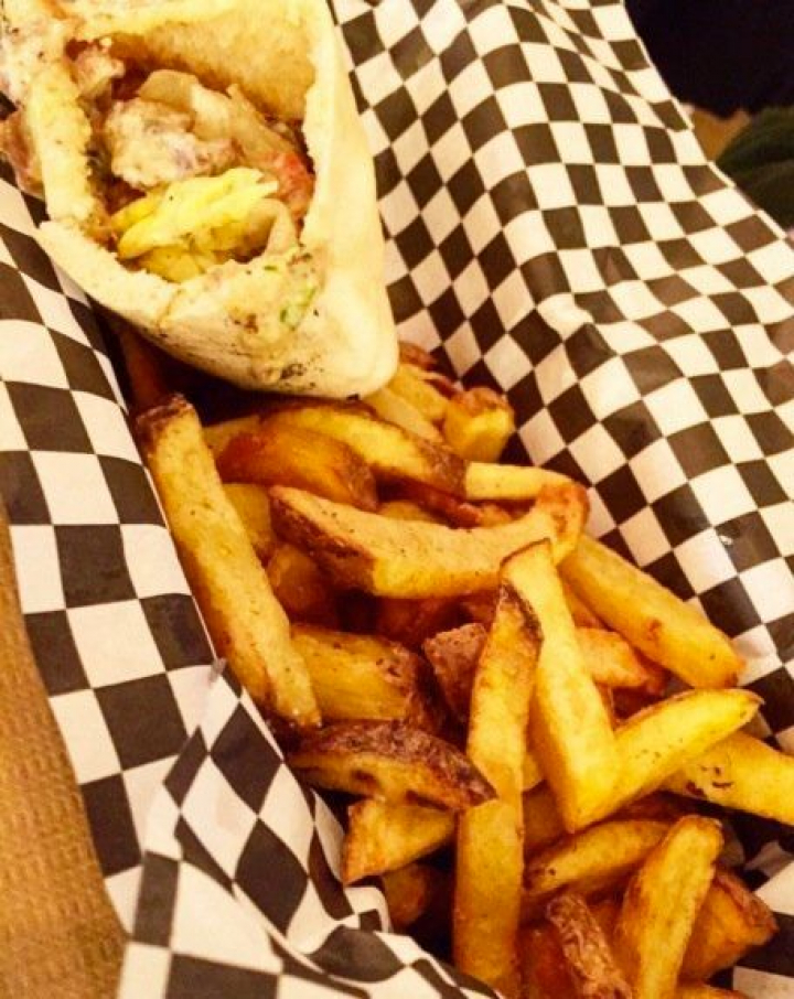 El kebab de cordero tiene un lecho de papel y se sirve con patatas fritas con su cáscara.
