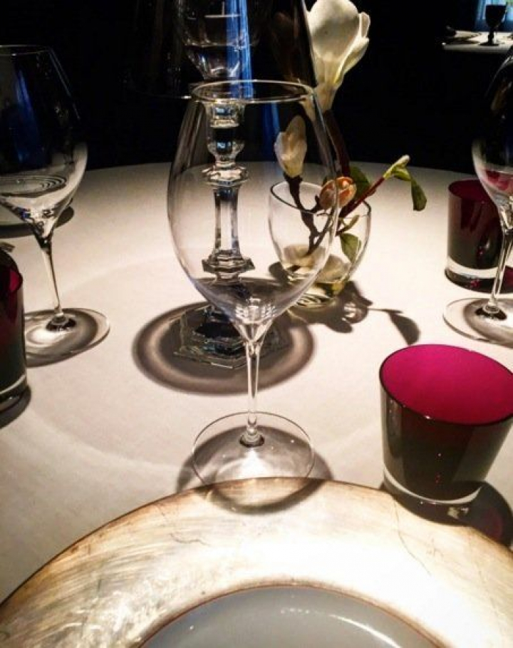 Y no creo que la falta de afluencia se deba a lo que menos me gustó: que el restaurante solo parece apto para cenas románticas e invernales por culpa de una decoración sombría en exceso. Sus paredes negras y sus terciopelos azules consiguen un efecto bello y elegante pero ahogan la luz y apenas se ve. Entrar en primavera o verano, abandonando en la calle un día soleado y luminoso, produce un efecto desasosegante, algo así como introducirse en el lado oscuro, aunque sin Darth Vader. No obstante es clásico y muy elegante, con un servicio atento y eficaz y muchos detalles de alta cocina del pasado (salvo la raquítica carta de vinos de estos comienzos), como el uso de campanas que ocultan el plato y al ser elevadas, como en una sorpresa infantil, permiten la explosión de aromas de los platos y la inesperada eclosión de formas y colores.