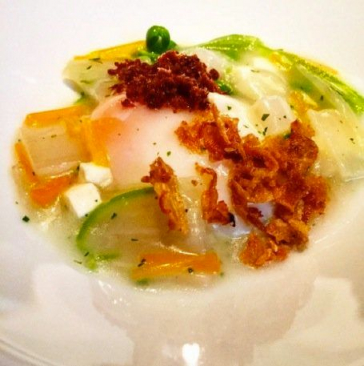 El huevo ecológico con menestra de verduras se corona con virutas de cebolla y jamón. Un plato sano, tradicional y delicioso que se anima con ese sencillo juego de texturas que le aportan los picadillos. Las hortalizas tienen un perfecto punto de cocción y son suaves, aterciopeladas y tan primaverales como una vergonzosa amapola.