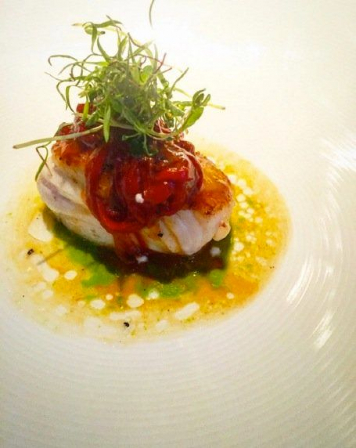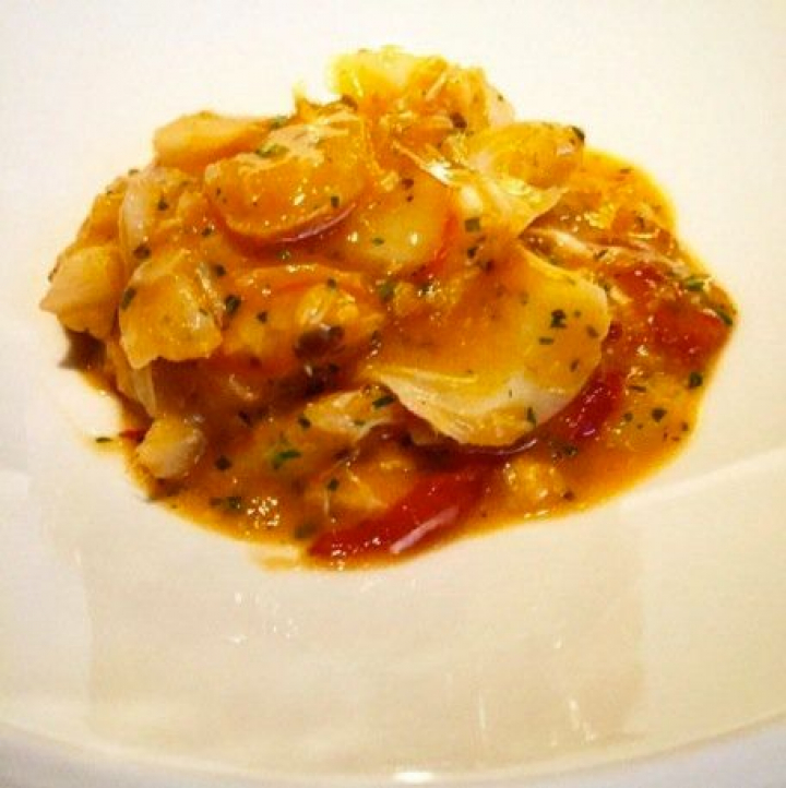 Si el centollo es una gloria del mar cómo se podría llamar a una excelsa merluza de anzuelo con vinagreta de manzana y pimientos de cristal "pilpileados". Quizá emperatriz del agua salada o princesa oceánica. Esta desde luego merece todos los piropos porque es delicada, perfectamente cocinada y con acompañamientos que no le restan sabor, ni el jugo ni el leve toque picante de estos adictivos pimientos llamados de cristal.