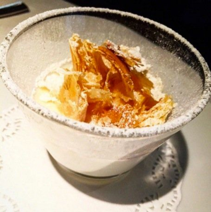 En este festival navarro los postres empiezan con una suave cuajada de leche de oveja que se anima con unos pedacitos de hojaldre crujiente llamados pailletes glaseados.