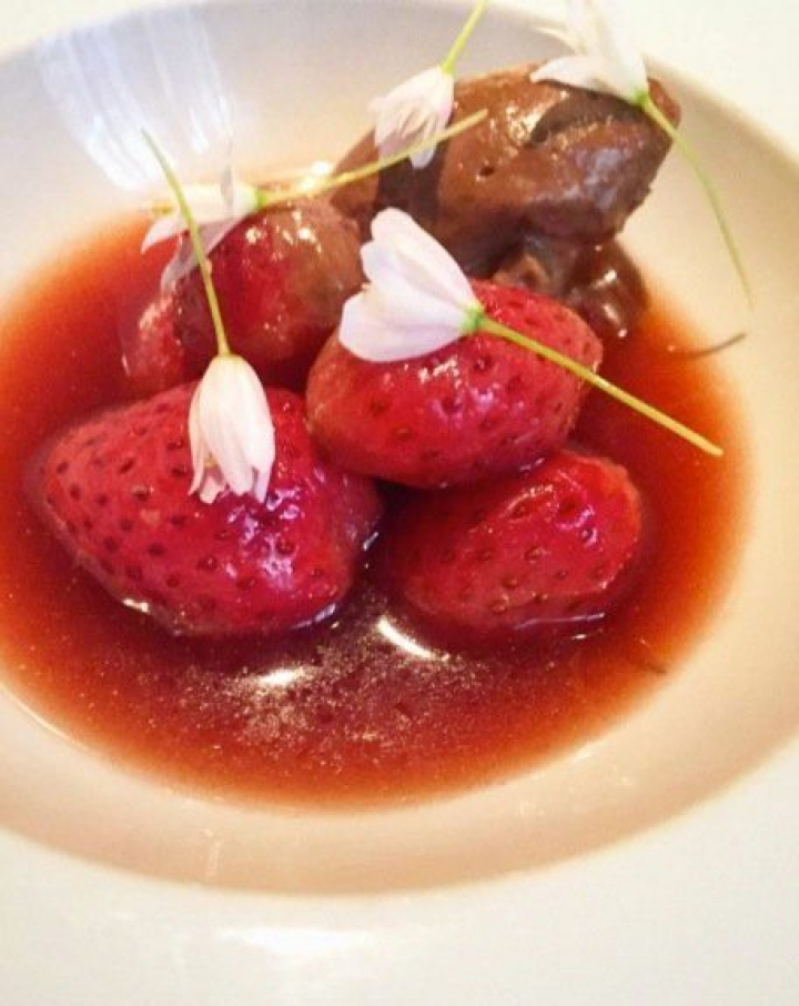 Como para mí no hay postre si no hay cacao, pedí un caprichito chocolatero y recibí un apetitoso plato de fresas con chocolate y sorpresa y lo llamo así por la flor de ajo y la salsa levemente salada que realzan enormemente el sabor del chocolate.