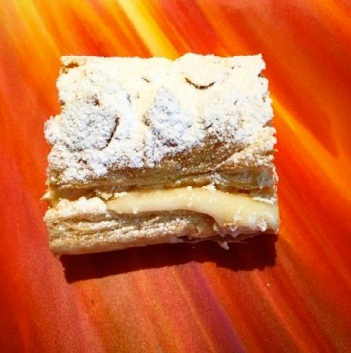 La panchineta llega en un hermoso plato naranja que engarza sus rubios toques de hojaldre. Tanto la masa como la crema están perfectas y además es un postre que se degusta y se ve, pero también se oye porque el hojaldre es tan quebradizo y lleno de capas que cruje muy audiblemente.