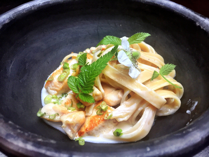 Calentar el wok a fuego vivo. Cortar en dados el pavo, sin grasa. Incorporar al wok bien caliente, añadir un poco de aceite de cacahuete, sellar bien el pavo y verter el coco, el caldo de ave y los palos de canela. Cocinar todo durante 12 minutos, hasta que la salsa se haya espesado un poco. Incorporar el resto de ingredientes, salvo la pasta. Dejar cocinar 3 minutos más y, mientras, saltear la pasta con un poco de agua y aceite de cacahuete. Servir bien caliente.