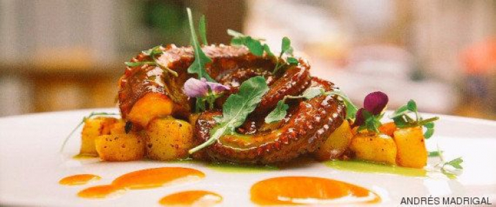 - Pasar el pulpo a una cazuela de barro o acero fundido e introducir en el horno a 220ºC durante un minuto rociando con el mojo.