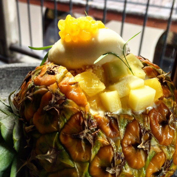 Escurrir la piña y ponerla en un cuenco, añadir el yogur de vainilla y mezclar. Rellenar la piña con la piña del cuenco, terminar coronando con una buena quenelle de helado de coco! y servir de inmediato.