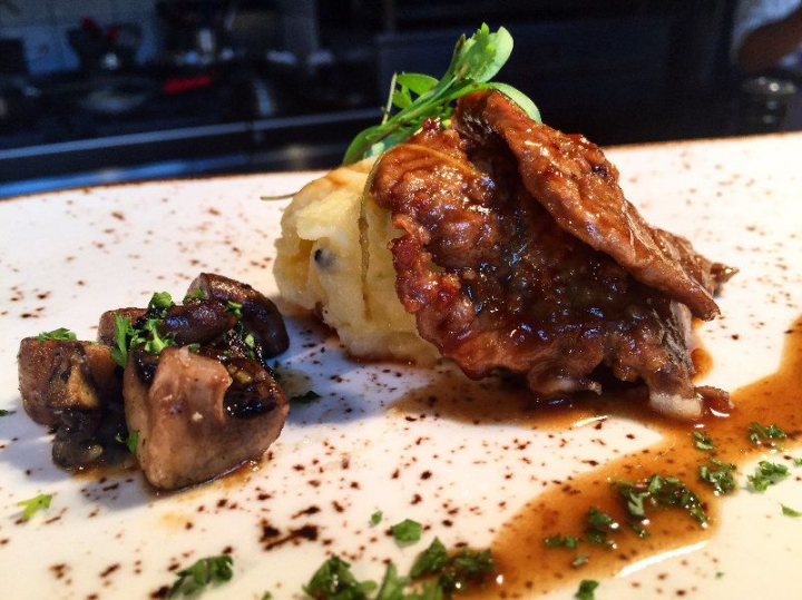 Colocar una base de puré, los escalopines, y bañar con la salsa junto con los portobellos.