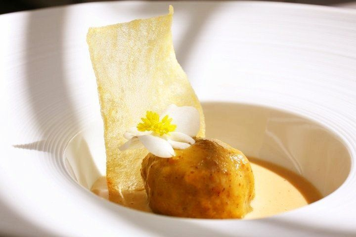 Albóndigas de gallina morunas sobre terciopelo de alcachofas y crema de hígado de pato