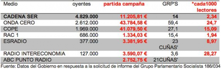 Esta práctica se repite en radios, donde a la CADENA SER (4.829.000 de oyentes) se le contrataron 5 veces menos inserciones que a su inmediato competidor, que cuenta con 2.217.000 millones menos de oyentes.