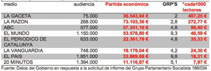 A EL PAÍS, con 1.851.000 lectores, se le contrataron inserciones por valor de 33.889,68 € mientras que LA RAZÓN, que tiene 7 veces menos lectores (268.000), percibió por inserciones publicitarias 73.103,36 €. Es decir más del doble.