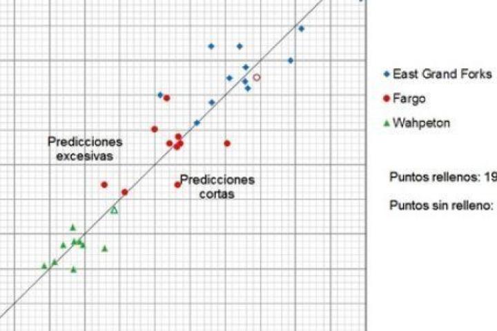 Como era previsible, el NWS recibió duras críticas por haber fallado en la predicción. Pero ¿qué es lo que falló realmente? Debería ser obvio que una predicción tan compleja a dos meses vista tiene un importante margen de error (1). Y así lo dejaban patente los desvíos de las predicciones anteriores -emitidas por el NWS la mayoría de los inviernos desde 1980 para el área metropolitana de Grand Forks y otras dos localidades ribereñas- de los niveles correspondientes observados, tal como muestra el gráfico. Estos errores vienen dados por las distancias en horizontal (o en vertical) de los puntos de la línea diagonal, que se corresponde con las predicciones perfectamente acertadas. Sin necesidad de un análisis más profundo, los datos anteriores a 1997 dejan claro que entra dentro de la normalidad que una predicción se quede corta en un 6% -suficiente para que con una predicción de 49 pies al final se supere la altura de los diques reforzados de 52 pies- y que ni siquiera el desvío de algo más de un 10% hasta los 54,35 pies finalmente alcanzados fue algo extraordinario ya que en años anteriores se habían producido errores superiores.