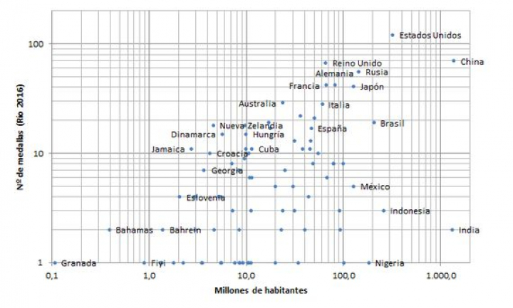 Dicho eso, el siguiente gráfico nos muestra la relación entre el número de medallas obtenidas en Río (representado en el eje vertical) y el de habitantes (en el eje horizontal) para todos los países medallistas, cada uno representado por un punto. El grueso de los países tiene números de medallas y de habitantes mucho menores que las 121 medallas estadounidenses y los más de 1.300 millones de habitantes de China y la India, respectivamente. Para evitar que se acumulen en una densa nube de puntos en la parte de abajo a la izquierda del gráfico donde apenas se les distinguiría, se ha optado por ejes logarítmicos.