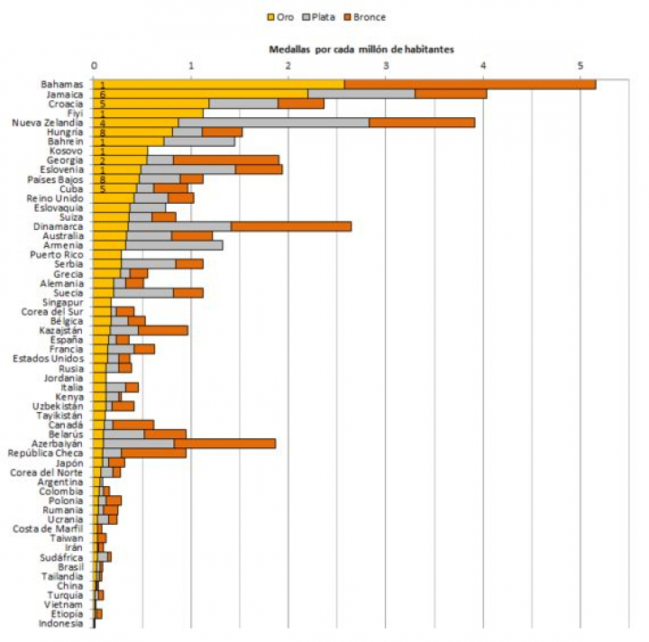 Un ejemplo más extremo si cabe nos lo brinda el minúsculo país caribeño de Granada con sus poco más de 100 mil habitantes que tampoco se había subido al podio jamás, hasta que Kirani James lo consiguió en los 400 metros masculinos en Londres 2012 y en Río 2016, lo que arroja un ratio de récord histórico de 9,4 medallas por cada millón de habitantes, es decir una barra que se saldría con creces de nuestro gráfico. Pero a diferencia de Londres, donde fue de oro, en Río esa única medalla del país fue de plata, por lo que el país no aparece en nuestro medallero.