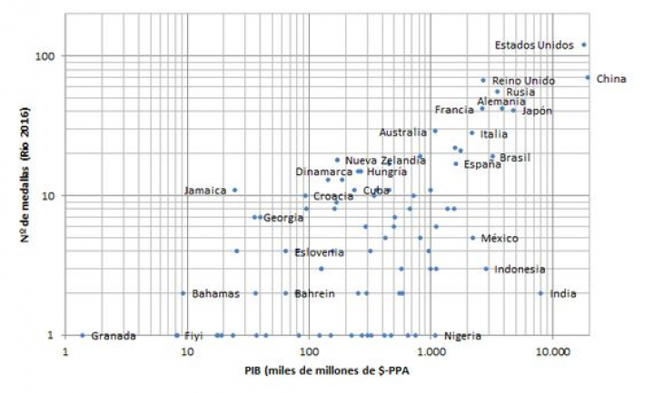 La distribución de los puntos muestra una forma parecida que en el gráfico con la población en el eje horizontal. Países como la India o Nigeria, abajo a la derecha, se han desplazado algo hacia la izquierda, ya que dada su baja renta per cápita no son tan grandes económicamente como lo son demográficamente en términos relativos. De esa forma, la anomalía de países grandes con pocas medallas aparece algo más reducida.