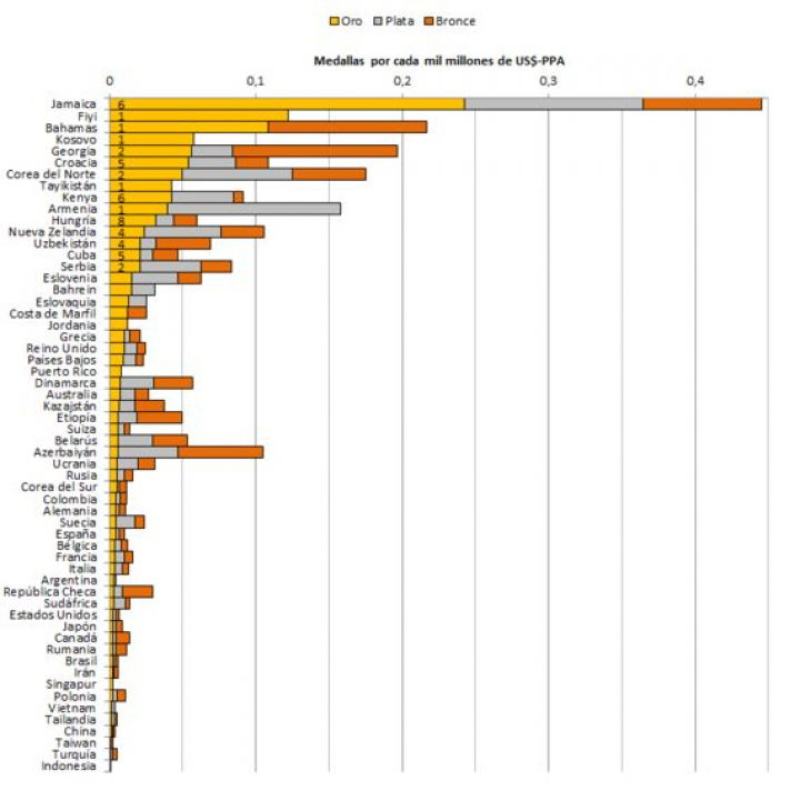Recuérdese que estamos clasificando los países según medallas de oro, solo incluyendo aquellos que obtuvieron ese tipo de metal, lo que deja fuera otra vez más a Granada con su plata, que con 0,73 medallas por cada mil millones de dólares PPA también aquí sería el líder de la clasificación con mucha diferencia si nos guiáramos por el número total de medallas.
