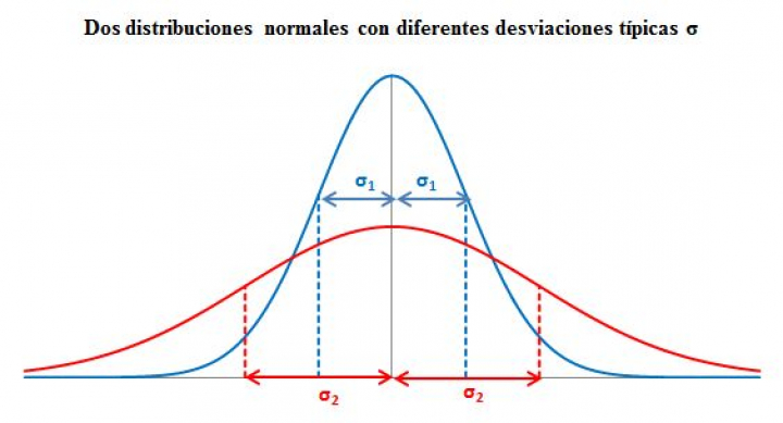 Para detectarlos necesitamos medidas de dispersión que cuantifiquen las oscilaciones alrededor de la media. Como ya vimos, nos podría servir un conjunto de cuantiles, pero hay un parámetro más compacto y especialmente indicado cuando los desvíos de la media son parecidos hacia ambos lados, que es la desviación típica, algo parecido a la desviación media de la media, sin distinguir hacia qué lado se produce dicho desvío (para ser más exacto, es la raíz cuadrada de la media de las desviaciones cuadráticas). El siguiente gráfico nos muestra dos distribuciones normales (con forma de campana de Gauss, un caso particular de nuestra campana simétrica, de gran importancia en la estadística) con la misma media (o que es lo mismo, moda y mediana), pero con diferentes desviaciones típicas, siendo la de la distribución roja (σ2) el doble de la de la distribución azul (σ1).