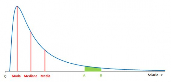 Si consideramos por ejemplo los salarios de una gran empresa, el salario medio tiene una interpretación de lo más intuitiva, siendo aquel que tocaría a cada empleado si se repartiera la masa salarial a partes iguales entre todos ellos. ¿Pero es un valor representativo que se corresponde con lo que gana el "empleado medio" de la empresa? Pues veamos una hipotética distribución salarial. La siguiente figura muestra la función de densidad, representada por la curva azul, que nos indica para cada salario (en el eje horizontal, creciente hacia la derecha) cómo de frecuente es (en vertical). Para ser más exacto, el área entre dos valores desde el eje horizontal hasta la curva azul es proporcional al número de empleados con salarios entre estos dos valores, como por ejemplo entre los salarios A y B en el caso del área verde. El área entero entre curva y eje se corresponde por tanto con el número total de empleados.
