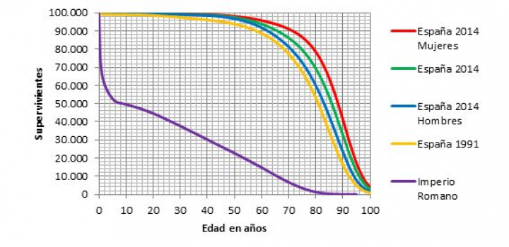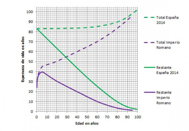 Fijémonos ahora en la curva de supervivencia estimada del imperio romano, que destaca por una forma radicalmente diferente frente a las de España que en los primeros años de vida apenas muestran una reducción de la cohorte. En cambio, en el imperio romano aproximadamente un tercio de los niños moría antes de cumplir un año (lo que se conoce como mortalidad infantil) y alrededor de la mitad antes de cumplir los cinco. Revisando los datos se observa que una vez superada esa edad, la edad más frecuente para morir era de unos 60 años, si bien muchos morían bastante antes, pero algunos también a edades considerablemente superiores. Por tanto, la esperanza de vida, que era de unos 24 años, no debe interpretarse en absoluto como la edad a la que los romanos solían morir, sino es la media resultante de una mitad de la población que moría en su primer lustro de vida y de la otra mitad que en su gran mayoría llegaba a edades muy superiores a estos 24 años.