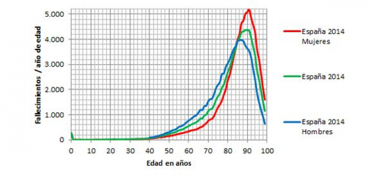 El Instituto Nacional de Estadística (INE) acaba de publicar las tablas de mortalidad del año 2014 para España que arrojan una esperanza de vida de 82,9 años, uno de los valores más altos del mundo, cuya media global ha traspasado recientemente los 70 años. Hay que aclarar que cuando aquí hablamos de esperanza de vida sin más especificaciones, nos referimos como se explicará más adelante a la llamada esperanza de vida al nacer. Se trata de un indicador fundamental desde el punto de vista de la salud, pero al reducir la mortalidad a un solo número nos da una información parcial que hay que interpretar con precaución. Veremos por qué no debe considerarse sin más como la edad típica a la que se suele morir (una esperanza de vida de 40 años de hace unos siglos no significa en absoluto que las personas eran ancianas a los treinta y tantos años) y por qué salvo catástrofe la gran mayoría de la actual población española alcanzará una edad superior a estos 82,9 años, o para ser más específico, usando las esperanzas de vida de cada sexo, de 85,6 años en el caso de las mujeres y de 80,1 años en el caso de los hombres.