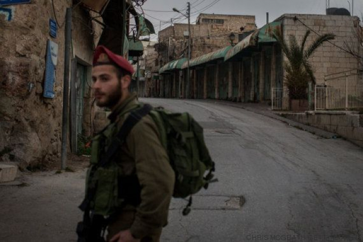 Un soldado israelí en un puesto de control que separa un asentamiento israelí en un barrio palestino dentro de la ciudad de Hebrón (Cisjordania).