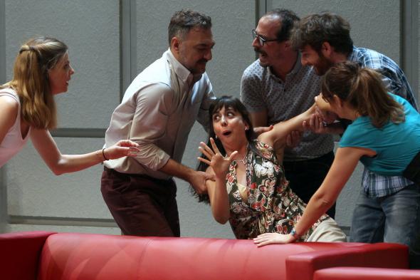 A falta de esa otra cosa, de ese otro nivel, y con la dirección en modo eficacia, la historia de tres parejas de treintañeros y cuarentones a los que su psicóloga reúne para una terapia de grupo se convierte en una suerte de situaciones que dan lugar al chiste y la risa explosiva. Y entre chiste y chiste, el público se despista, pierde conexión con lo que pasa en escena. A lo que no ayuda el atropello en el decir y el hacer de los actores (aunque esto seguro que lo corrigen a medida que vaya rodando el espectáculo).