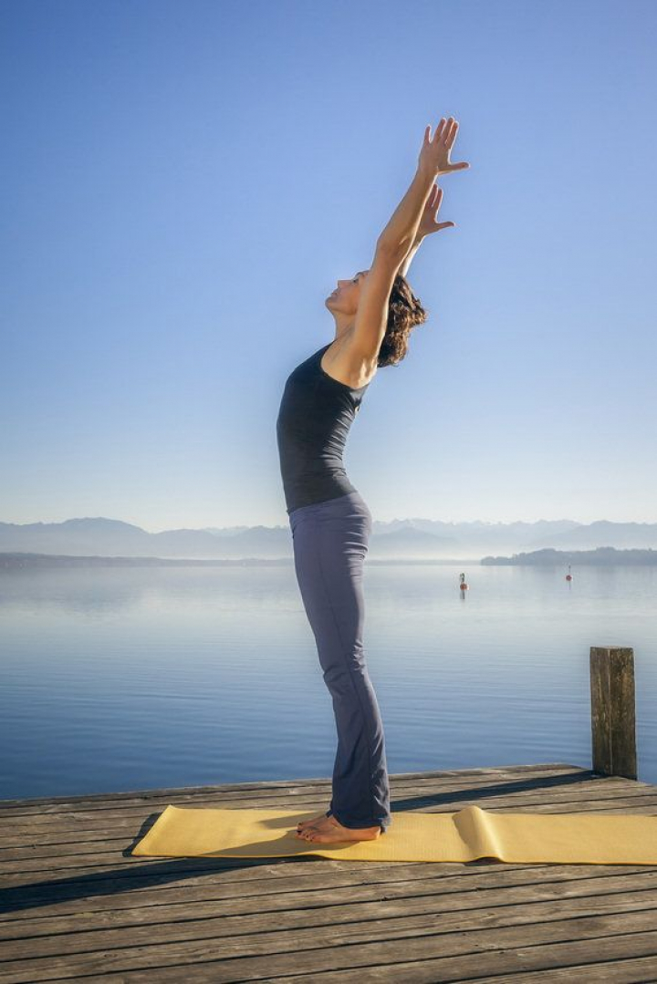 De pie con los pies separados al ancho de las caderas, inhalando crece hacia el cielo al mismo tiempo que levantas los brazos con las manos enfrentadas. Al exhalar, dobla un poco las rodillas y flexiona el tronco sobre las piernas, lleva las manos al suelo. Vuelve a inhalar y estírate hacia el cielo de nuevo. Al ritmo de la respiración continúa con este movimiento durante un par de minutos.