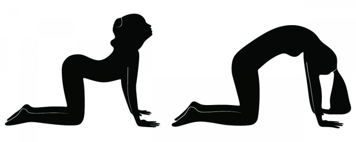 • Gato - Vaca. Apoya en el suelo las rodillas y las manos formando una base estable. Exhalando, redondea tu espalda sacando una joroba y llevando la barbilla hacia el pecho. Inhalando, haz el movimiento contrario, lleva la mirada hacia delante, y estira la columna vertebral arqueando ligeramente la zona lumbar. Continúa con el movimiento lentamente, al ritmo de tu respiración.