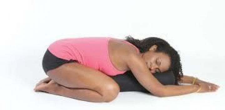 5. Balasana o el feto. Siéntate sobre los talones y separa las rodillas al ancho de tus caderas. Coloca delante de ti longitudinalmente el mismo cojín o manta enrollada como un rulo. Suavemente inclínate hacia delante hasta que tu abdomen y pecho se apoyen sobre el cojín. Descansa suavemente una mejilla sobre el cojín. Los brazos descansan a los lados del cojín. Mantén la postura durante el tiempo que quieras.