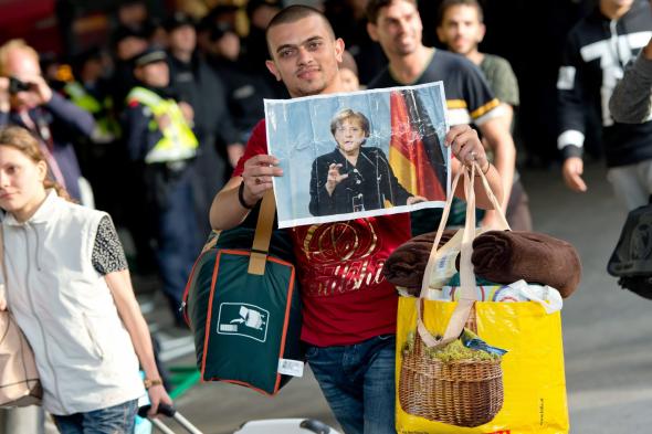 Un refugiado recién llegado a Munich lleva un foto de la canciller alemana. EFE