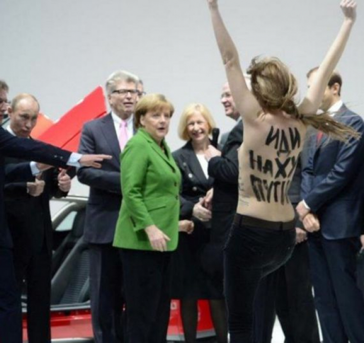 Estaba Vladimir Putin en la Feria Internacional de la Industria de Hannover, recorriendo el stand de Volkswagen y viendo el XL1 (el coche con el consumo más bajo de combustible del planeta) acompañado de la canciller alemana Merkel, cuando varias mujeres haciendo topless les asaltaron con el cuerpo escrito, entre gritos.