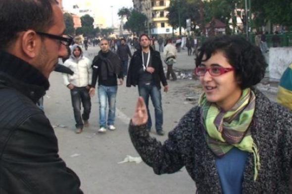 Aida Elkashef y Basel Ramsis, en la plaza, mañana del 3 de febrero de 2011, contándole lo de la PlayStation. Foto: Hany Darweesh.