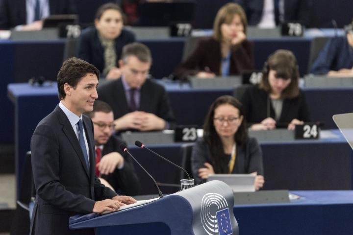 El primer ministro de Canadá, Justin Trudeau, hablando ante el Parlamento Europeo. (Foto: EFE)