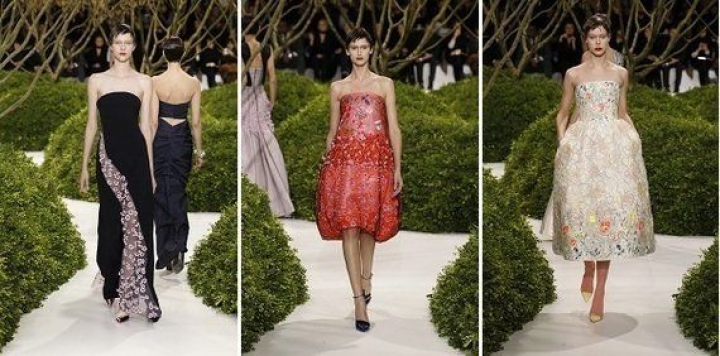 En el desfile se retrataron los árboles desnudos e invernales de París. El blanco brillante de la sala recordaba a la nieve que había cubierto la ciudad días atrás, creando un jardín con laberinto formado por setos topiarios. El escenario diseñado por el paisajista Martin Wirtz con alisos desnudos, setos de buxus rococo y modelos emergiendo entre ellos como flores que crecen en el jardín, se convirtió en una oda a la primavera.
