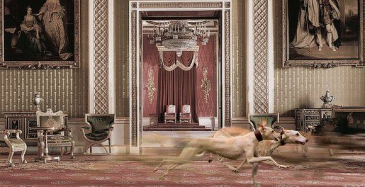 Galgos atravesando el salón del trono de Buckingham Palace.