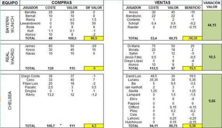 El equipo con mejor rentabilidad de los traspasos realizados es el Bayern de Munich, que consiguió fichar a Lewandowski, valorado en 50 millones, a coste cero. El Borussia Dortmund fue el perjudicado del cambio de camiseta del delantero polaco, pero sin duda fue el club con un mejor balance de compras a nivel global.