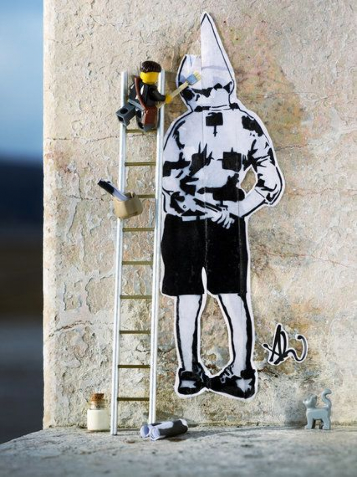 Entre pañales que iban y venían y siestas de su bebé, descubrió y comenzó a crear los universos con sus Lego. Le encantaba customizar los muñecos con las infinitas posibilidades que ofrecen los elementos que fabrica la marca de juguetes danesa. Lo que en un principio se inició casi a modo de distracción comenzó a engancharle, a ocupar mucho más su tiempo y a convertirse en algo realmente importante. Tal es así que desde hace dos años, ya con un nuevo bebé de siete meses en la familia, es su profesión. En su obra, lo esencial son las buenas ideas (reconozcámoslo, no todo el mundo las tiene) que luego escenifica recurriendo al arte callejero en miniatura, la escultura, la pintura, el origami y sus maniquíes.
