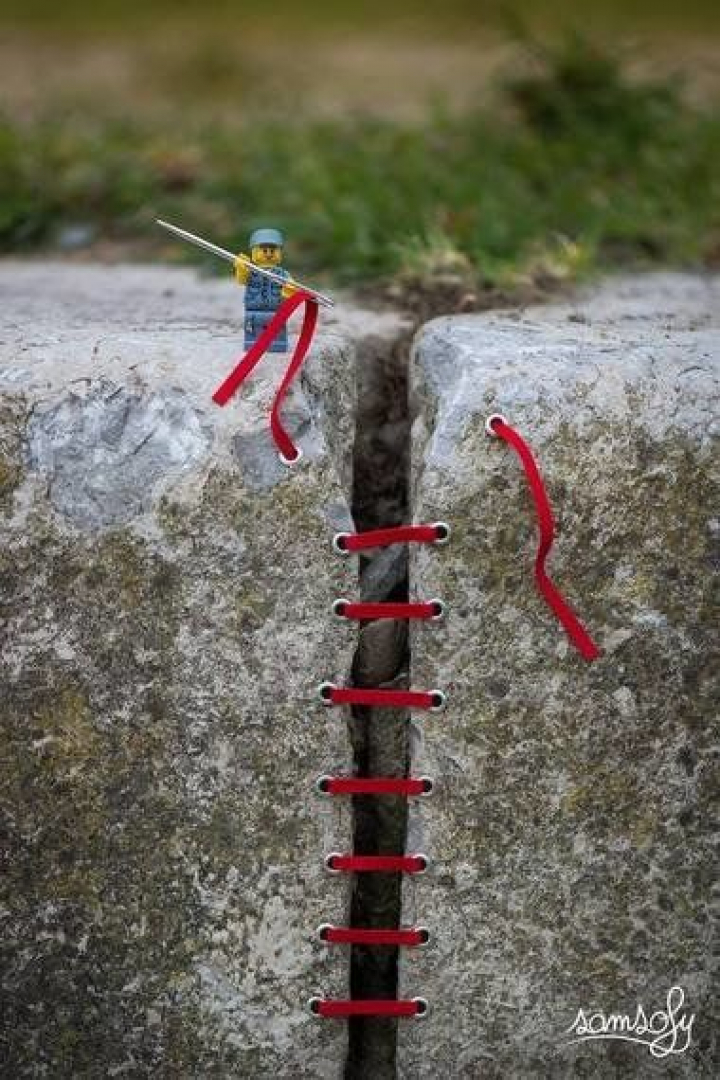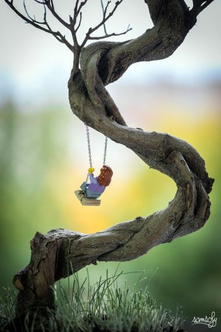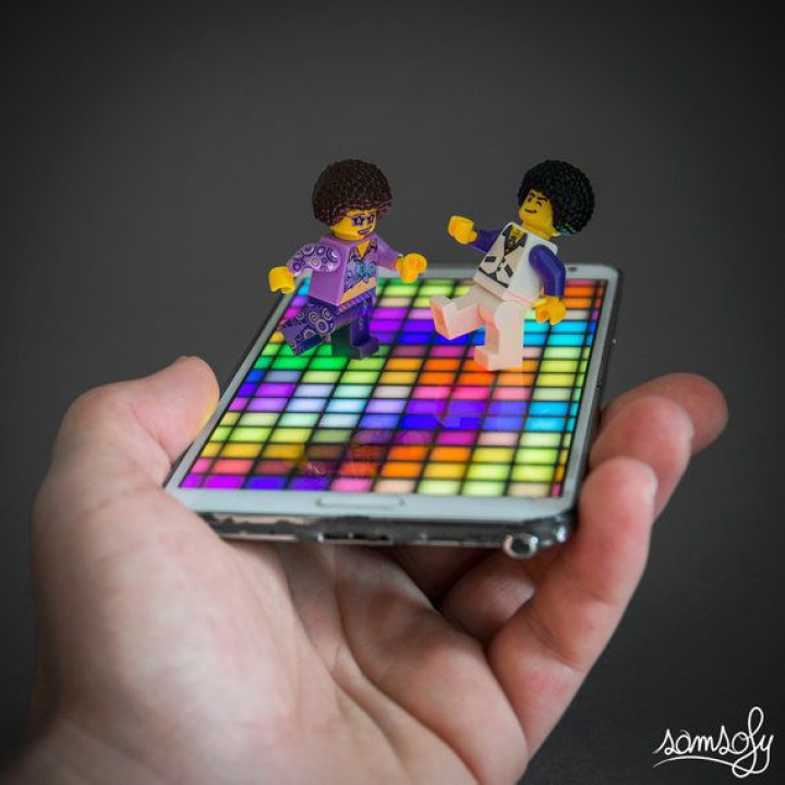 Mecánico, comercial, artista plástico, instructor de deportes y educador juvenil Sofiane Samlal (1981), afincado en Lyon, es un hombre orquesta. Samsofy, el ex fotógrafo de skating acrobático -que también es él y ahora más que nunca- crea instantes combinando técnicas fotográficas, arte callejero, instalaciones y trabajando con unos modelos muy peculiares: los muñecos de Lego. Tras pasar todos estos elementos pasados por la minipimer de su imaginación, deja su rastro y sus mensajes que, habitualmente, mezclan humor, política e incluso poesía.