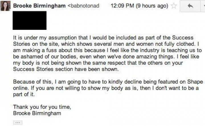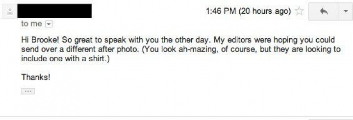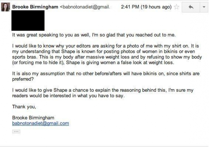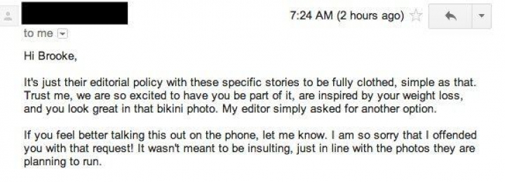 Luego me pidió que reconsiderara mi decisión, que mi historia era genial y que me daría mucha difusión. Le dije que no buscaba publicidad, que soy una persona honesta y que sentía que la historia no me estaba dejando ser sincera si no podía compartir esa foto. Le dije que si su política consistía en mostrar a gente totalmente vestida, también deberían aplicarla al resto de su página web. Me dijo que lo entendía, y eso fue todo.