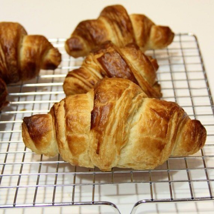 El mostrador de la panadería engalanado de croissants crujientes recién salidos del horno que acompañarán la celebración de nuestro primer café con leche. El corazón esponjoso del croissant se sumerge con gusto en la densidad del café.