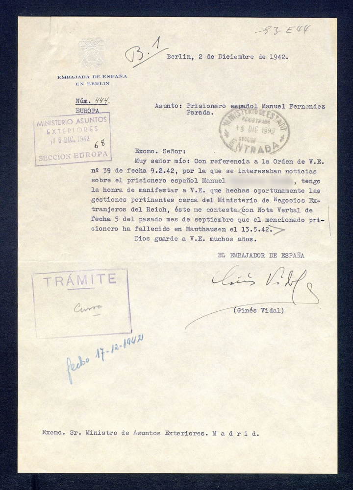 Entre la serie de pruebas que he reunido en mi libro, hay una más terrenal pero tanto o más determinante que la anterior, ya que demuestra que el Régimen franquista no solo sabía que había españoles en los campos, sino que decidía quién debía vivir y quién debía morir en ellos. En los archivos del Ministerio de Asuntos Exteriores existen varios expedientes de prisioneros de Mauthausen por los que intercedieron las autoridades españolas. Se trataba de jóvenes prisioneros, cuyas familias tenían contactos en las altas esferas del Gobierno. Cuando los funcionarios franquistas consideraron que no se trataba de "rojos peligrosos", solicitaron su liberación a Berlín. En dos casos concretos, los de Fernando Pindado y Joan Bautista Nos, esa repatriación se produjo. Sin embargo, en otras ocasiones la petición llegó tarde y la Embajada española en la capital del Reich se vio obligada a trasladar a Exteriores la misma respuesta: «Hechas oportunamente las gestiones pertinentes cerca del Ministerio de Negocios Extranjeros del Reich, este me contesta que el mencionado prisionero ha fallecido en Mauthausen».