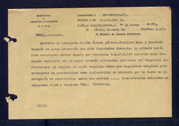 En numerosos telegramas enviados por los diplomáticos españoles destinados en naciones ocupadas se demuestra el descontento y la perplejidad ante la cerrazón de sus superiores. Quizás el más significativo de todos es el que envió el cónsul general en París al ministro de Asuntos Exteriores. En él hay unos puntos suspensivos que reflejan todo el horror y la muerte que provocó la estrategia del Régimen franquista: «Familias Mayo y Abastado, después de larga detención han sido deportadas Alemania. Ambas han sufrido ......... consecuencias señaladas» en telegramas anteriores. El abatido cónsul, explicaba lo ocurrido. Una de las familias había sido autorizada a entrar en España, pero la decisión se dilató tanto, que llegó tarde. La otra familia «no había cumplido todos los requisitos exigidos para considerar su nacionalidad como indiscutible, no entrando por tanto en la categoría de repatriados», es decir, no se había hecho nada por evitar su deportación a los campos de exterminio.