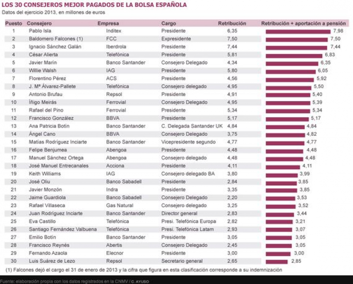 1.- La retribución anual de los Consejeros de las principales empresas, especialmente del Ibex 35 (que no incluye la aportación al plan de pensiones). Según dichos datos, fue la siguiente: los consejeros, ejecutivos o no, mejor retribuidos, fueron 30.