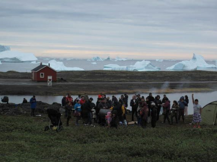 El solsticio de verano, el 21 de junio, es el día de la fiesta nacional de Groenlandia y la comunidad se reunió junto a unas rocas frente a la bahía cargada de icebergs varados. Las rocas sirvieron como hogar para colocar ollas y sartenes en las que cocinaron carne de foca y ballena (ésta ultima también se come cruda). El combustible para los fuegos eran pequeñas plantas secas, que cubren las laderas de las montañas, pues a esta latitud ya no crecen árboles ni plantas de porte arbóreo. La comunidad está autorizada a cazar dos ballenas al año que comparten entre ellos. A la noche (aunque no hay noche durante el verano en Qeqertarsuaq) toda la comunidad se reunió en el polideportivo que sirve como centro de comunidad, pues es el único espacio con capacidad para todos los habitantes. Allí cenaron, se celebró la entrega de premios a miembros de la comunidad por hechos destacados durante el año y una exhibición de polka groenlandesa, con rápidos giros, taconeo sobre el suelo y paseos con paso gallardo con la pareja por la pista. Muchas niñas de la comunidad lucían orgullosas el traje tradicional groenlandés, con unas altas botas blancas que llegaban hasta la ingle donde se encontraban con unos pantalones cortos con culera de foca, y unos gruesos pantalones de lana por debajo, en el cuerpo un blusa muy decorada con flores y una especie de capa echa con cuentas de colores que cubre pecho, espalda y hombros. Los hombres llevaban un anorak (que es prenda inuit), de colores según su rango en la comunidad. Nuestro amigo Akaaraaq resultó jugar un papel de liderazgo en esta comunidad y actuaba como maestro de ceremonias del evento.