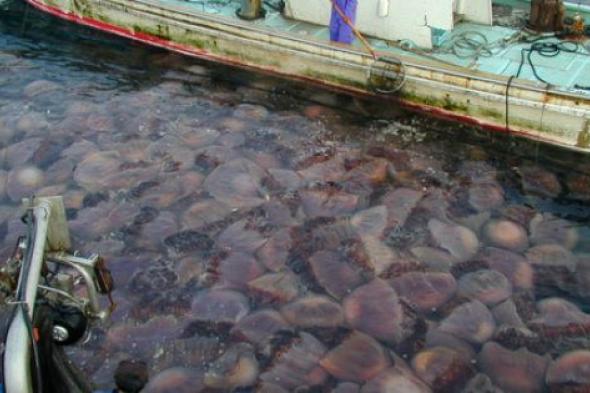 Las profileraciones de medusas gigantes (Nemopilema nomurai), que llegan a pesar una tonelada y a medir hasta 2 m de diámetro, revientan las redes de los pescadores en Japón. Foto: Sin-ichi Uye, Universidad de Hiroshima, Japón.