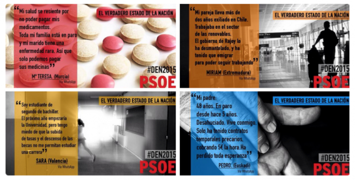 Los socialistas no disponen de armamento nuclear en Twitter, por lo que, si bien a primera hora de la mañana optaron por realizar un fallido ( y aburridísimo) fact-checking del discurso de Rajoy con fotofrases precocinadas ( Si el fact checking no se hace en tiempo real no sirve para nada), inmediatamente cambiaron y comenzaron a contraponer historias personales a los datos de Rajoy. Y eso, amigos, siempre funciona, a las personas les ENCANTAN las historias de otras personas.