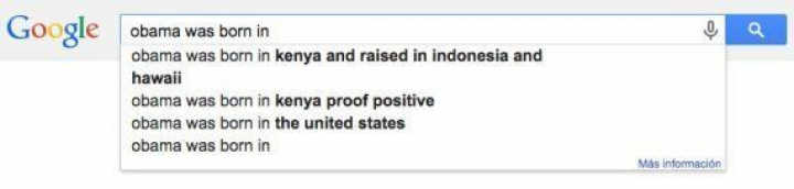 Las búsquedas en Google son un animalito fascinante: introduciendo unas palabras, su motor, usado por millones de personas a diario, te sugiere las más populares. Si introducimos algo tan sencillo como "Obama was born in..." ( Obama nació en...), atentos al sorprendente resultado.