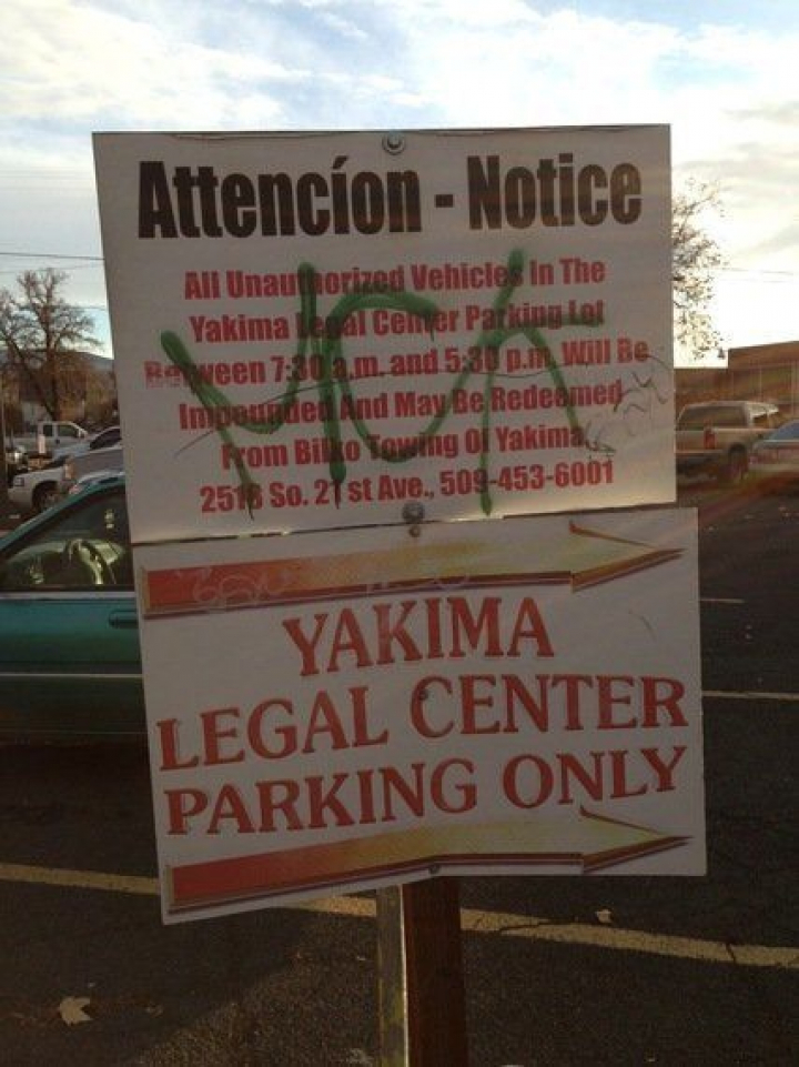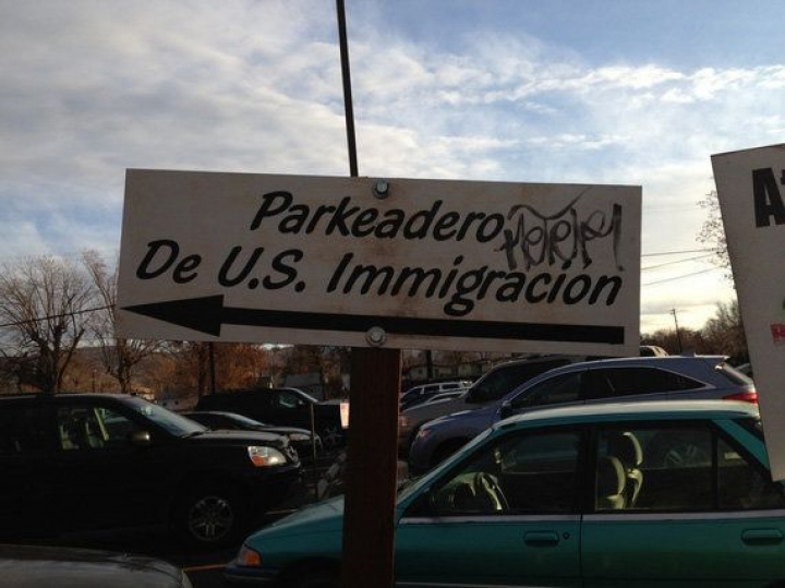 Y de lo dicho, permítaseme utilizar como botón de muestra estas dos señales de tráfico ubicadas en el aparcamiento anexo al edificio de inmigración en una ciudad en la que la mayoría de la población que pasa por los alrededores es, al menos teóricamente, hispanohablante. Este tipo de ejemplos son abundantes.