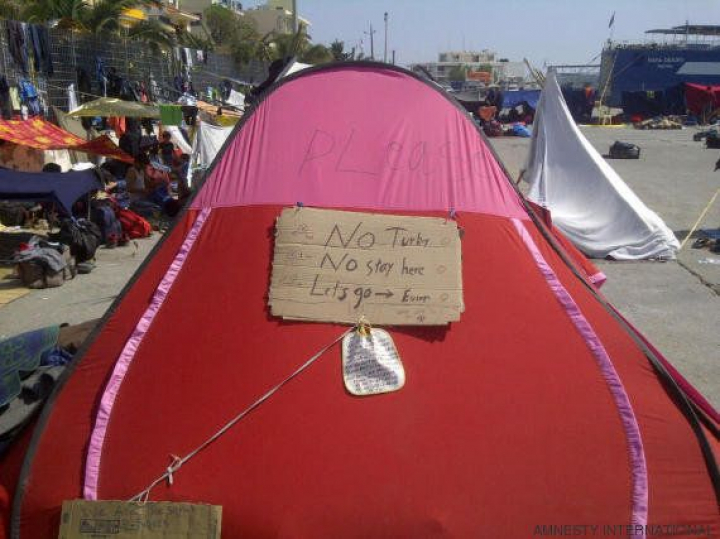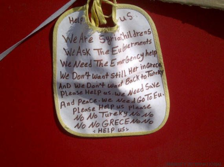 Una carpa de color rojo intenso y rosa que estaba en mitad del muelle exhibía varios carteles escritos a mano con peticiones de ayuda. Uno de ellos, garabateado en el babero de un bebé, decía: "Ayúdanos. Somos niños sirios. Necesitamos... ayuda urgente. No queremos (estar) aún aquí, en Grecia. Y no queremos (ser devueltos) a Turquía. Necesitamos seguridad y paz."